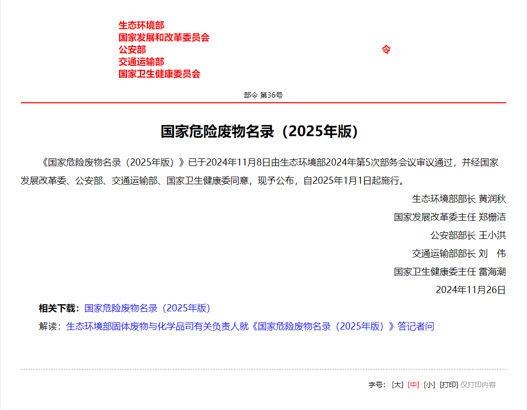 近日,生态环境部、国家发展改革委、公安部、交通运输部和国家卫生健康委修订发布《国家危险废物名录(2025年版)》(以下简称《名录》)。本次修订主要集中在鉴别后危险废物的归类管理、精准识别危险废物、危险废物豁免管理等三个方面。