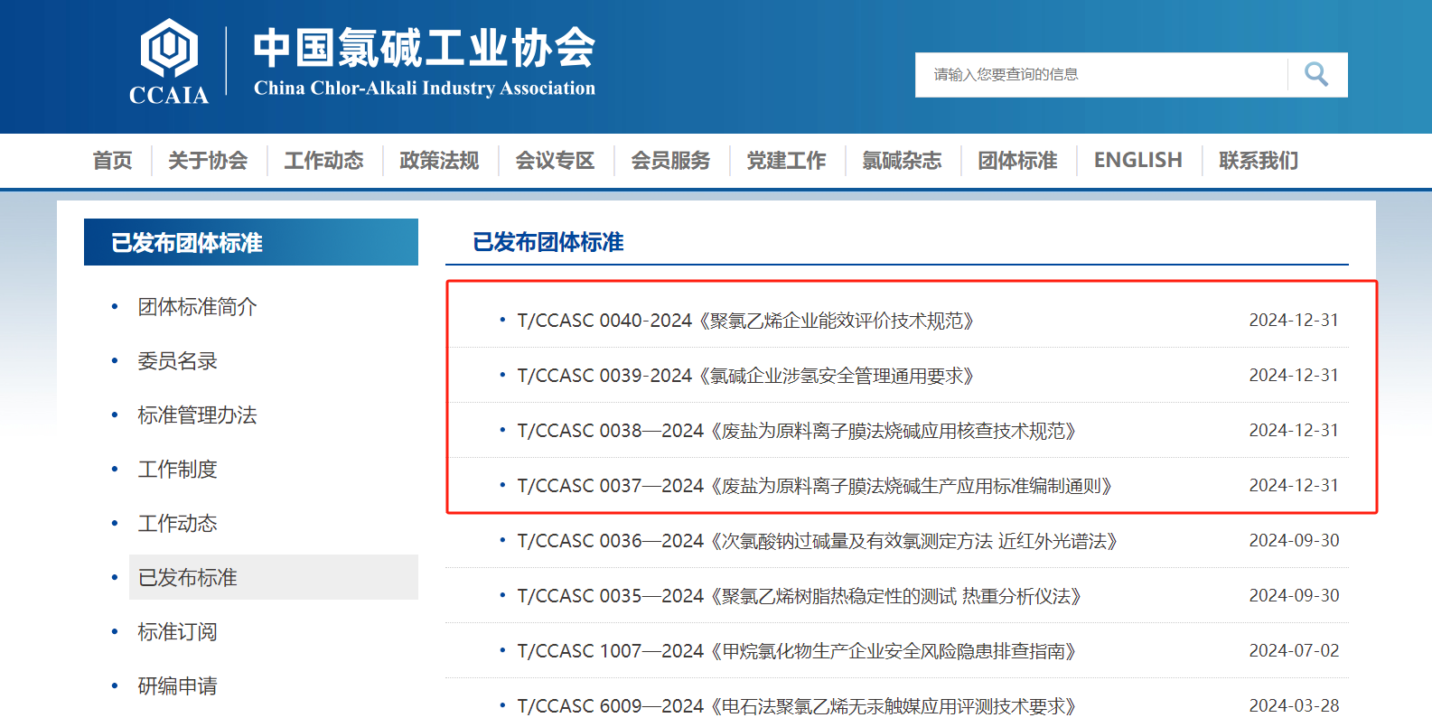 近日,中国氯碱工业协会发布T/CCASC 0037—2024《废盐为原料离子膜法烧碱生产应用标准编制通则》、T/CCASC 0038—2024《废盐为原料离子膜法烧碱应用核查技术规范》、T/CCASC 0039—2024《氯碱企业涉氢安全管理通用要求》、T/CCASC 0040—2024《聚氯乙烯企业能效评价技术规范》四项团体标准,该四项团体标准于2025年01月01日起实施。