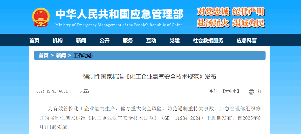 为有效管控米兰(中国)一站式服务官网企业氯气生产、储存重大安全风险,防范遏制重特大事故,应急管理部组织修订的强制性国家标准《米兰(中国)一站式服务官网企业氯气安全技术规范》(GB 11984-2024)于近期发布,自2025年8月1日起实施。